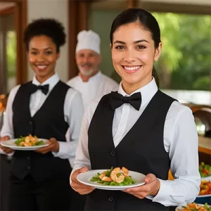Contamos com uma equipe altamente treinada — garçons, bartenders, cozinheiros e recepcionistas — garantindo atendimento ágil, cordial e profissional. Nosso casting é selecionado com rigor para entregar excelência em todos os tipos de eventos.