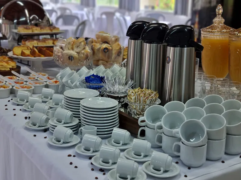 A FS Buffet e Eventos cuida de toda a montagem, serviço e organização, garantindo praticidade e um início de dia agradável para todos.
